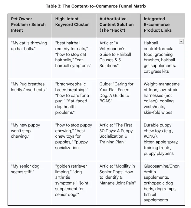 This defines the "Authority Engine" strategy. The e-commerce store must become the most trusted, expert resource for pet owners' questions.